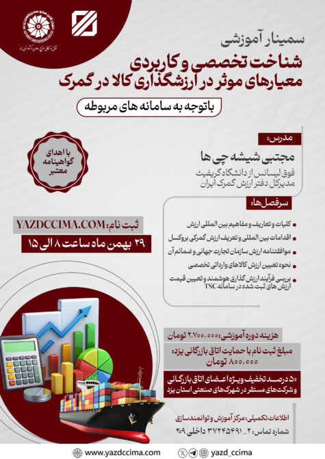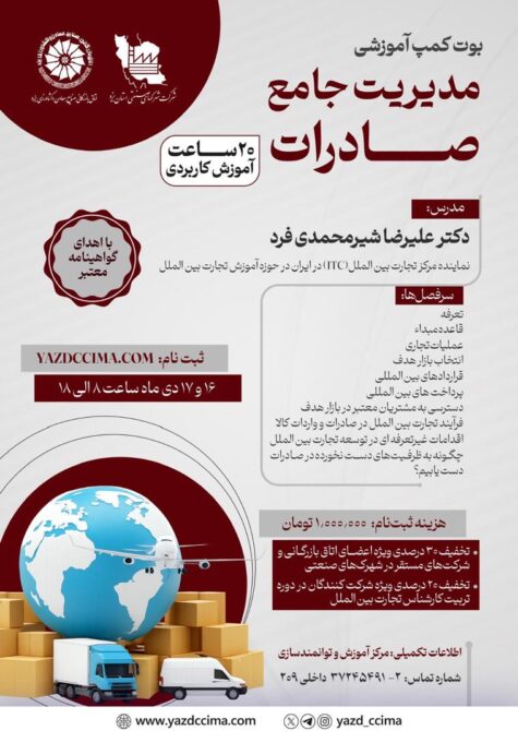 اتاق بازرگانی صنایع، معادن و کشاورزی یزد میزبان دوره های مختلف آموزشی است. همچنین میتوانید از جدیدترین رویدادها و نمایشگاه های تجاری در ایران و دنیا مطلع شوید.