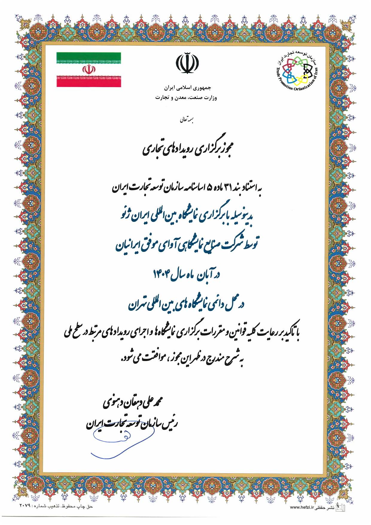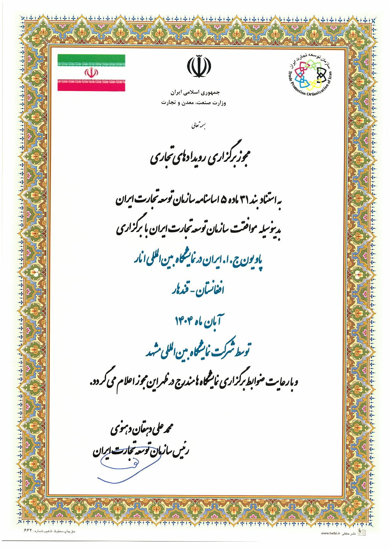 مجوز برگزاری پاویون جمهوری اسلامی ایران در نمایشگاه بین‌المللی انار افغانستان _ قندهار در آبان‌ماه 1404