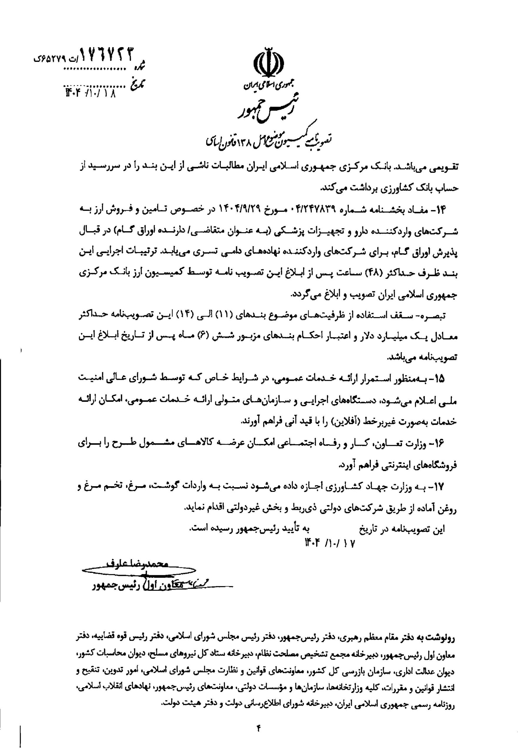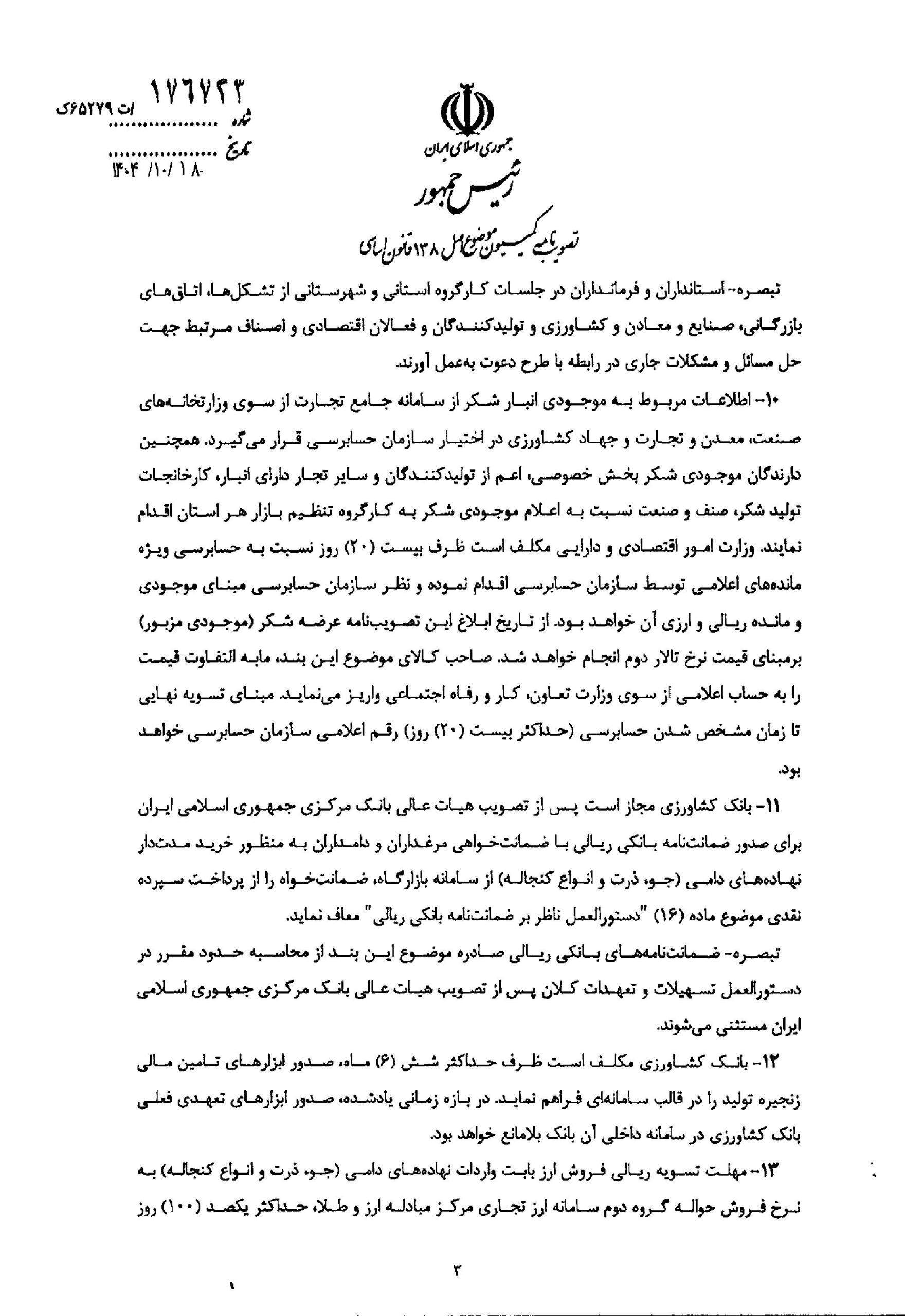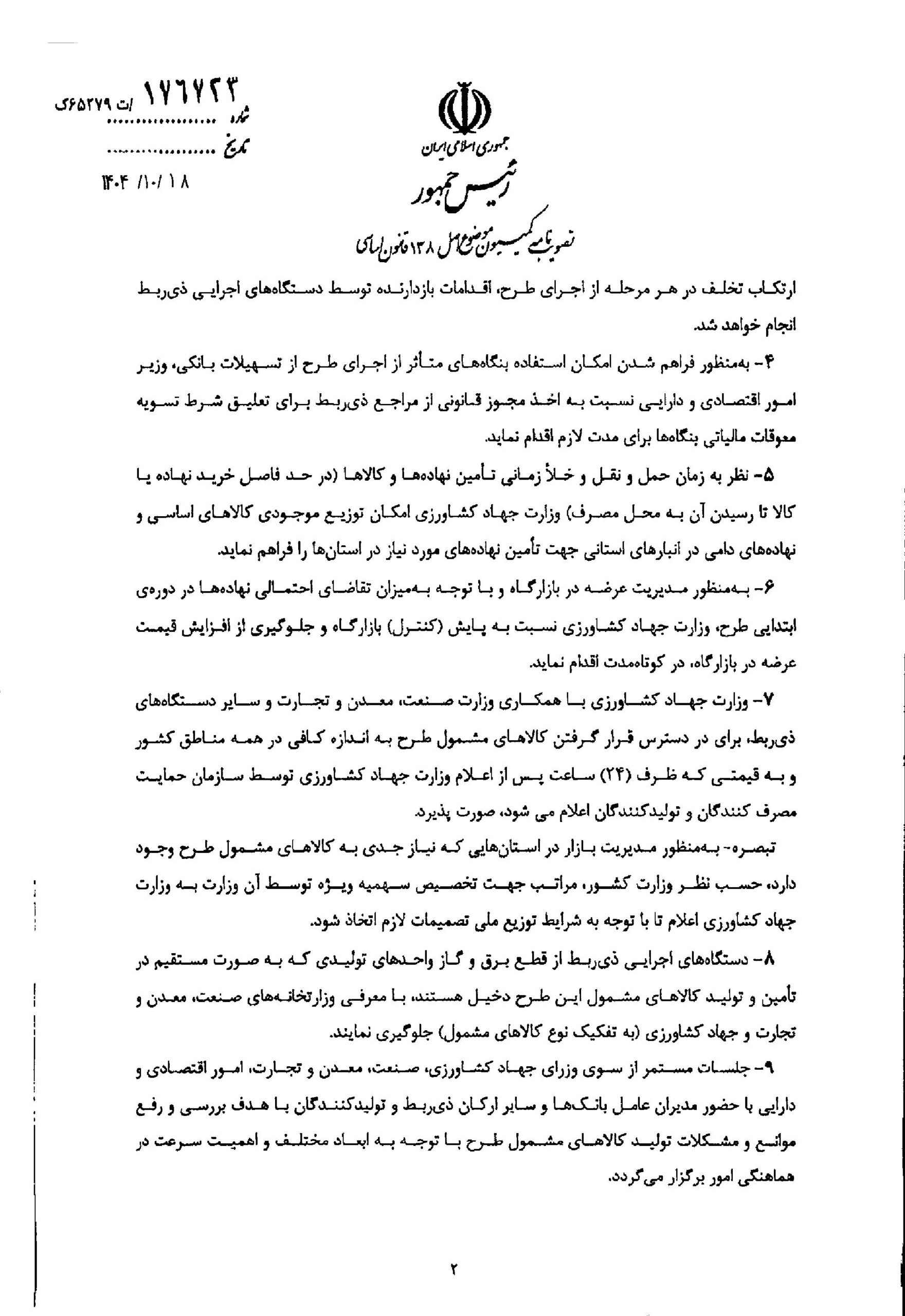 تاریخ انتشار: ۷ بهمن, ۱۴۰۴ ساعت ۱۹:۴۲ کد خبر: 20591 ابلاغ تصویبنامه کمیسیون موضوع اصل 138 قانون اساسی درخصوص آیین نامه تضمین امنیت غذایی و بهبود معیشت مردم فایل های پیوست ابلاغ تصویبنامه کمیسیون موضوع اصل 138 قانون اساسی| پیوست 1 ابلاغ تصویبنامه کمیسیون موضوع اصل 138 قانون اساسی| پیوست 2 ابلاغ تصویبنامه کمیسیون موضوع اصل 138 قانون اساسی| پیوست 3 ابلاغ تصویبنامه کمیسیون موضوع اصل 138 قانون اساسی| پیوست 4 دیدگاه ها توسط مدیر سایت بسته شده اند.
