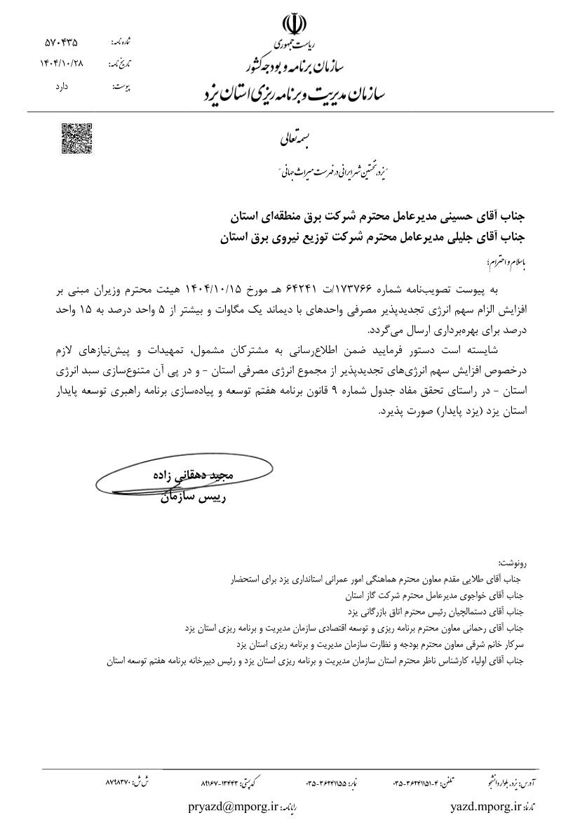 تاریخ انتشار: ۱۳ بهمن, ۱۴۰۴ ساعت ۱۳:۴۷ کد خبر: 20749 مصوبه هیات وزیران مبنی بر الزام سهم انرژی تجدید پذیر تصویبنامه هیئت وزیران مبنی بر افزایش الزام سهم انرژی تجدیدپذیر مصرفی واحدهای با دیماند یک مگاوات و بیشتر از 5 واحد درصد به 15 واحد درصد فایل های پیوست مصوبه هیات وزیران مبنی بر الزام سهم انرژی تجدید پذیر مصوبه هیات وزیران مبنی بر الزام سهم انرژی تجدید پذیر | پیوست دیدگاه ها توسط مدیر سایت بسته شده اند.