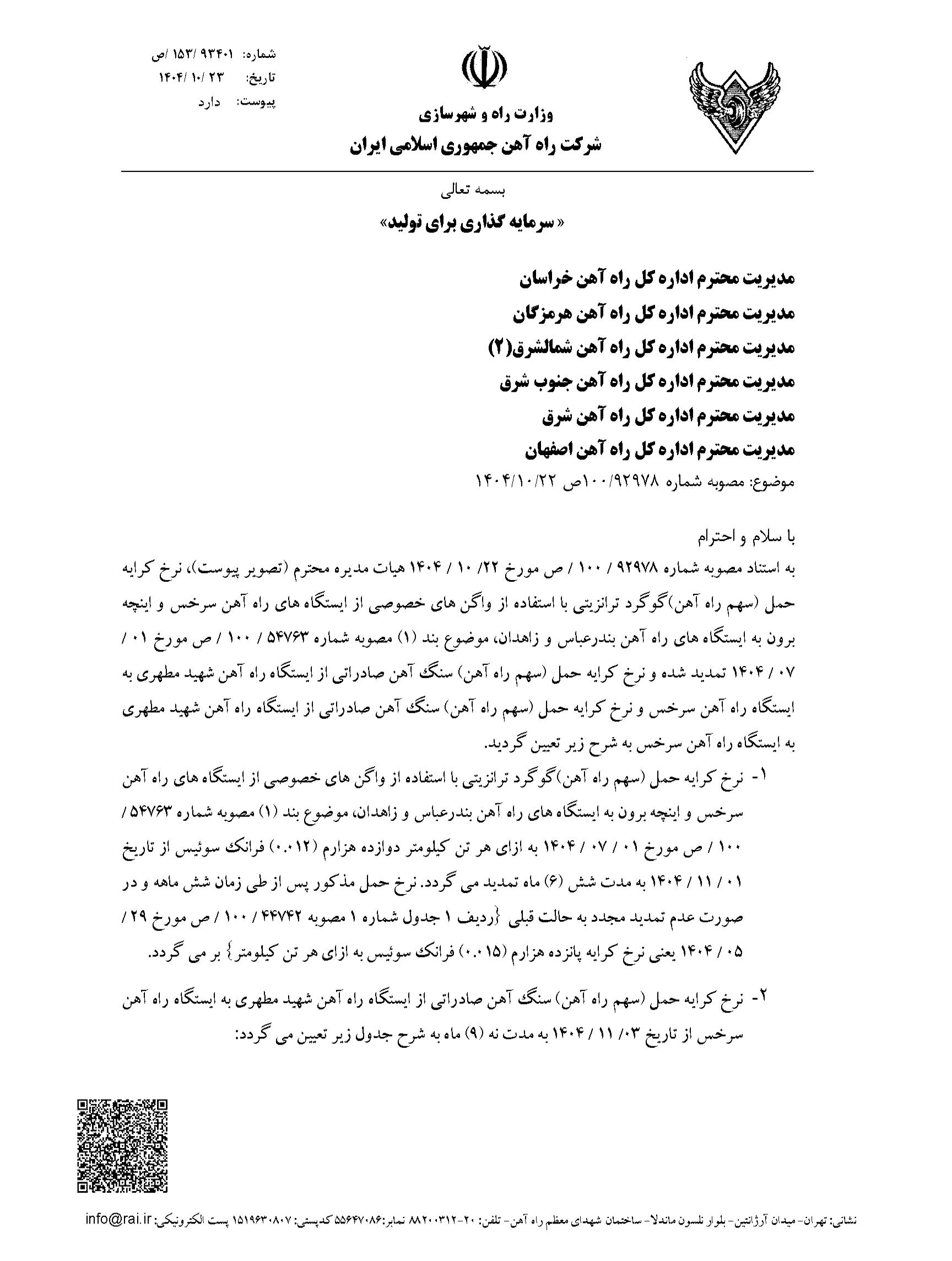 تمدید نرخ حمل برخی محمولات در برخی مسیرها در راه آهن جمهوری اسلامی ایران