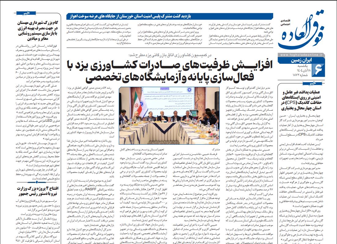 بریده جراید افزایش ظرفیت های صادرات کشاورزی یزد با فعال سازی پایانه و آزمایشگاه های تخصصی تاریخ: 18 آبان, 1404 08:15 محل انتشار: روزنامه فوق العاده گروه موضوعی: