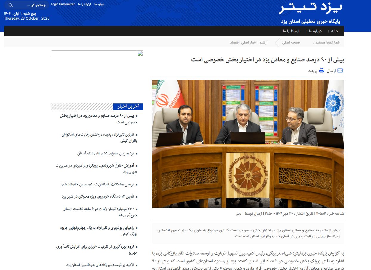 بیش از ۹۰ درصد صنایع و معادن یزد در اختیار بخش خصوصی است