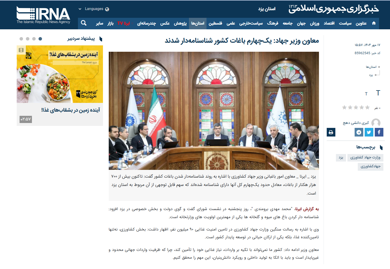 بریده جراید معاون وزیر جهاد: یکچهارم باغات کشور شناسنامهدار شدند تاریخ: 17 مهر, 1404 08:52 محل انتشار: خبرگزاری ایرنا گروه موضوعی: لینک مطلب: https://irna.ir/xjVGPG