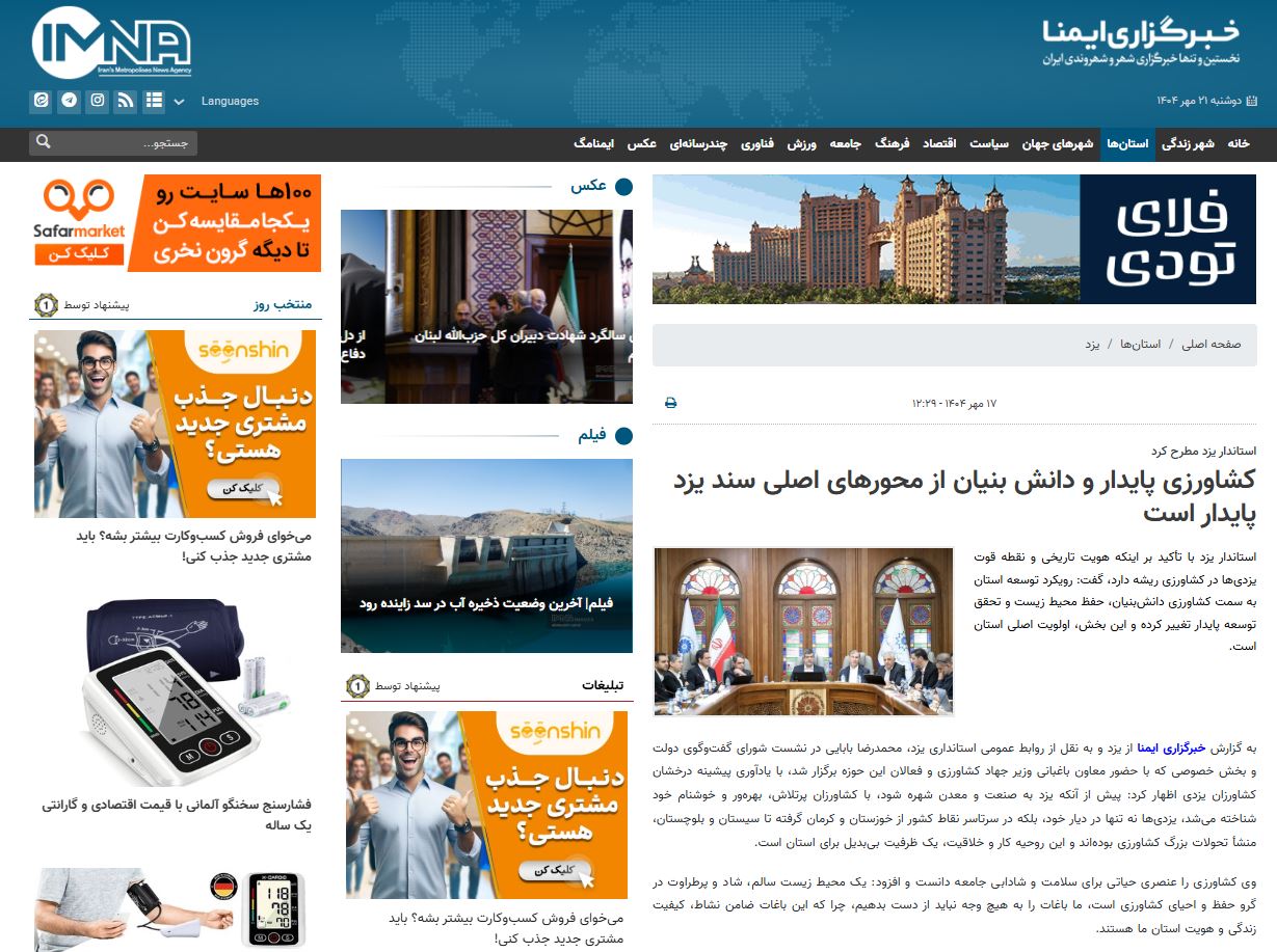 بریده جراید کشاورزی پایدار و دانش بنیان از محورهای اصلی سند یزد پایدار است تاریخ: 17 مهر, 1404 07:48 محل انتشار: خبرگزاری ایمنا گروه موضوعی: لینک مطلب: https://imna.ir/x9Mtt