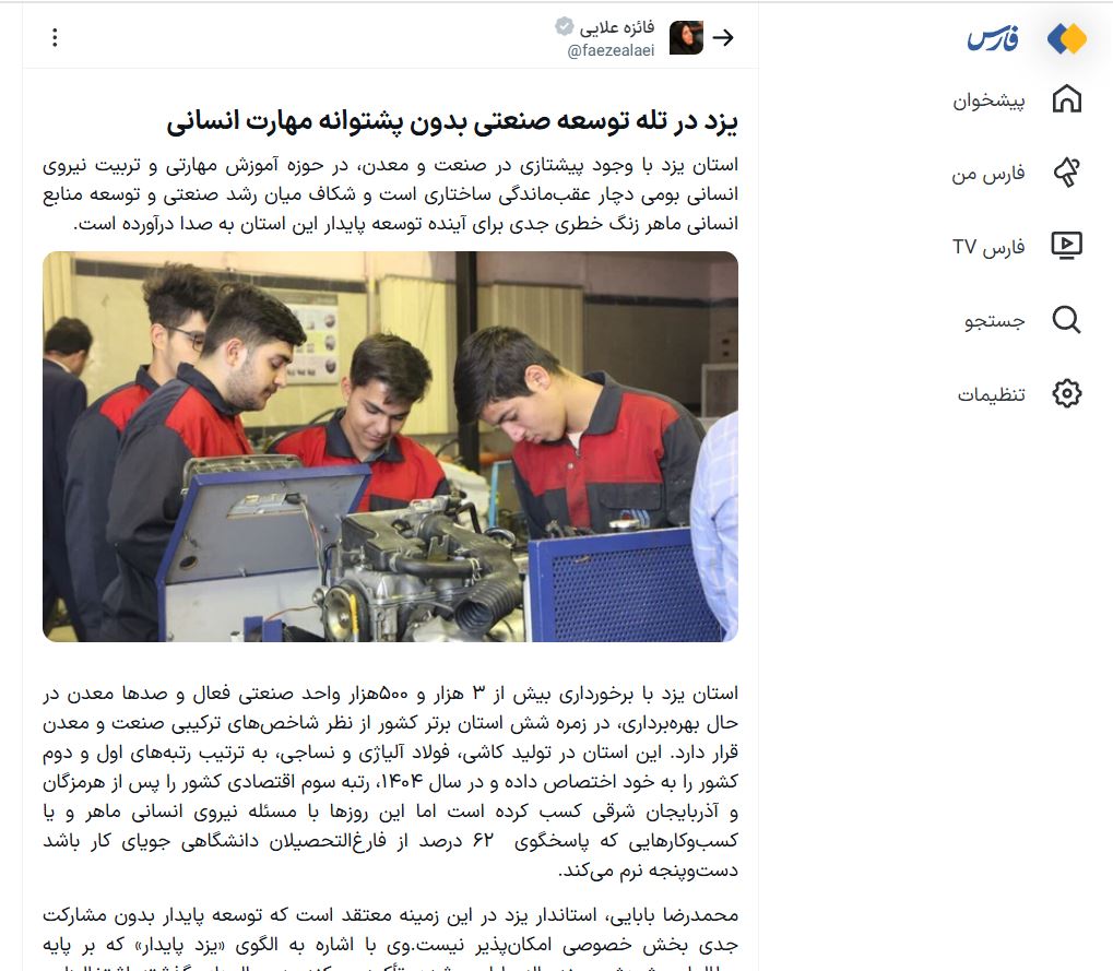 بریده جراید یزد در تله توسعه صنعتی بدون پشتوانه مهارت انسانی تاریخ: 13 آبان, 1404 09:58 محل انتشار: خبرگزاری فارس گروه موضوعی: لینک مطلب: https://search.eitaa.com/?url=https://farsnews.ir/faezealaei/1762279101155131665